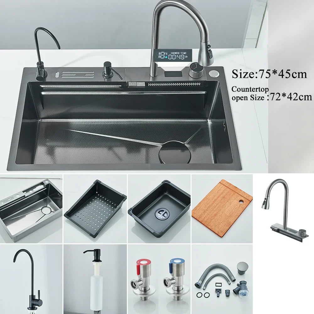 Hownifety Waterfall Sink Kitchen Stainless Steel Topmount Sink Large Single Slot Wash Basin With Multifunction Waterfall Faucet